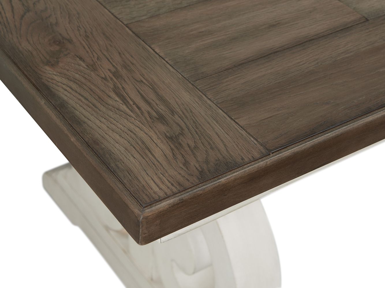 Features//+ The two-toned rustic white and French oak finish give it an inviting look//+ Made of rustic knotty oak veneer and select hardwood that makes it functional and durable//+ Features a unique harp-style base//+ Center drawer flips down for easy access//+ Features 2 wide utility drawers for ample storage space
