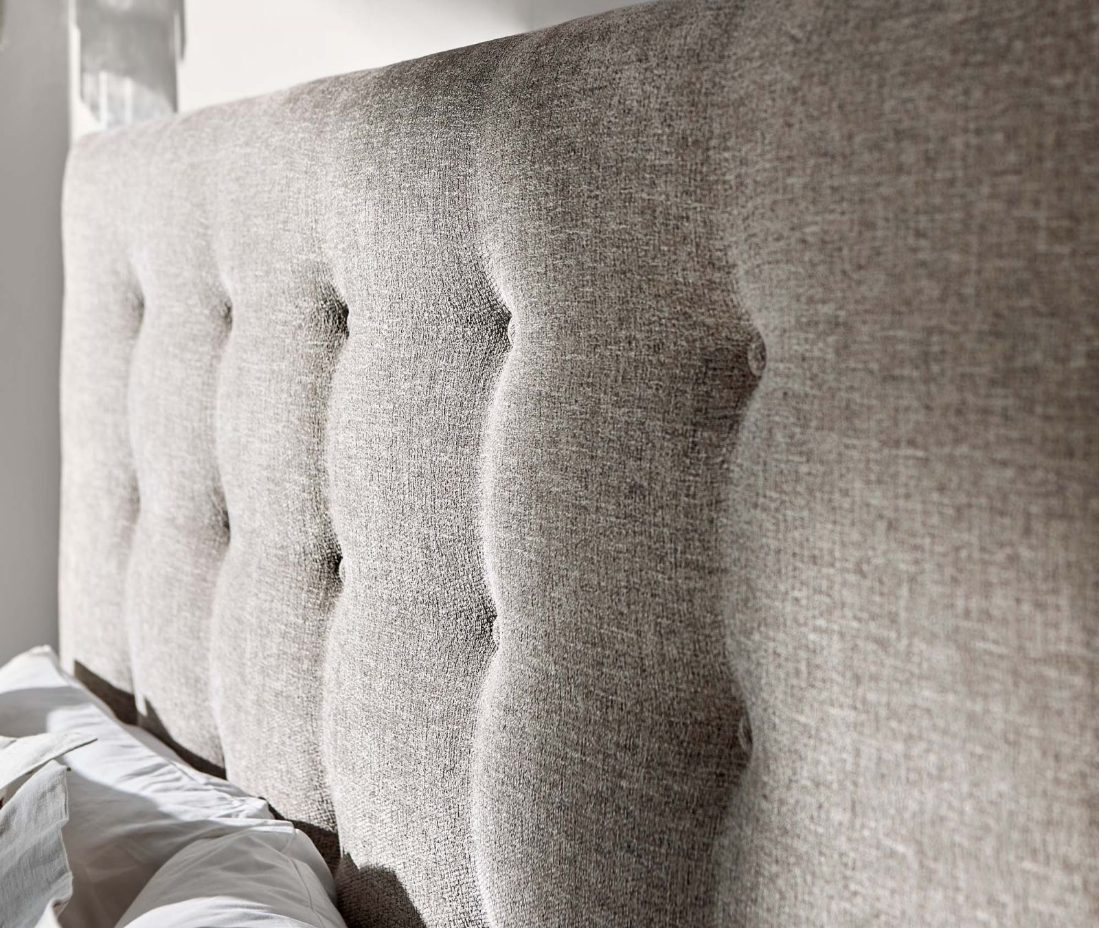 Upholstered panel with light button-tufting with support panels in Light Shale finish