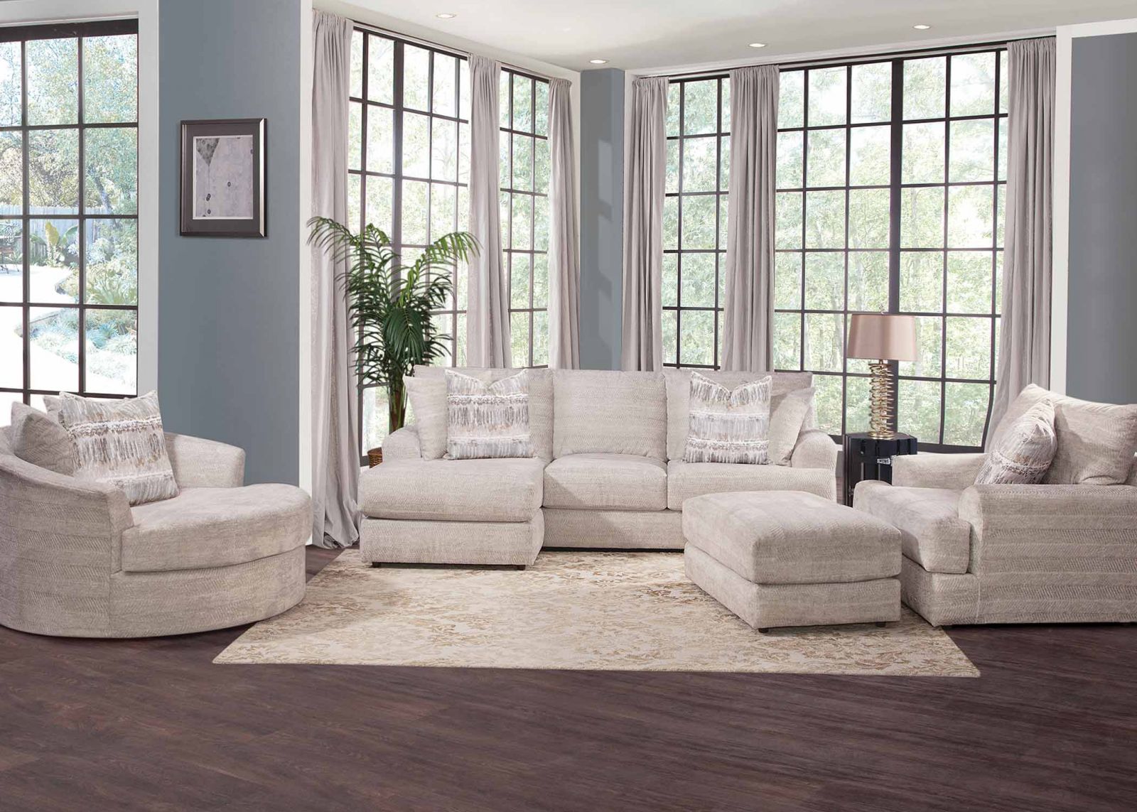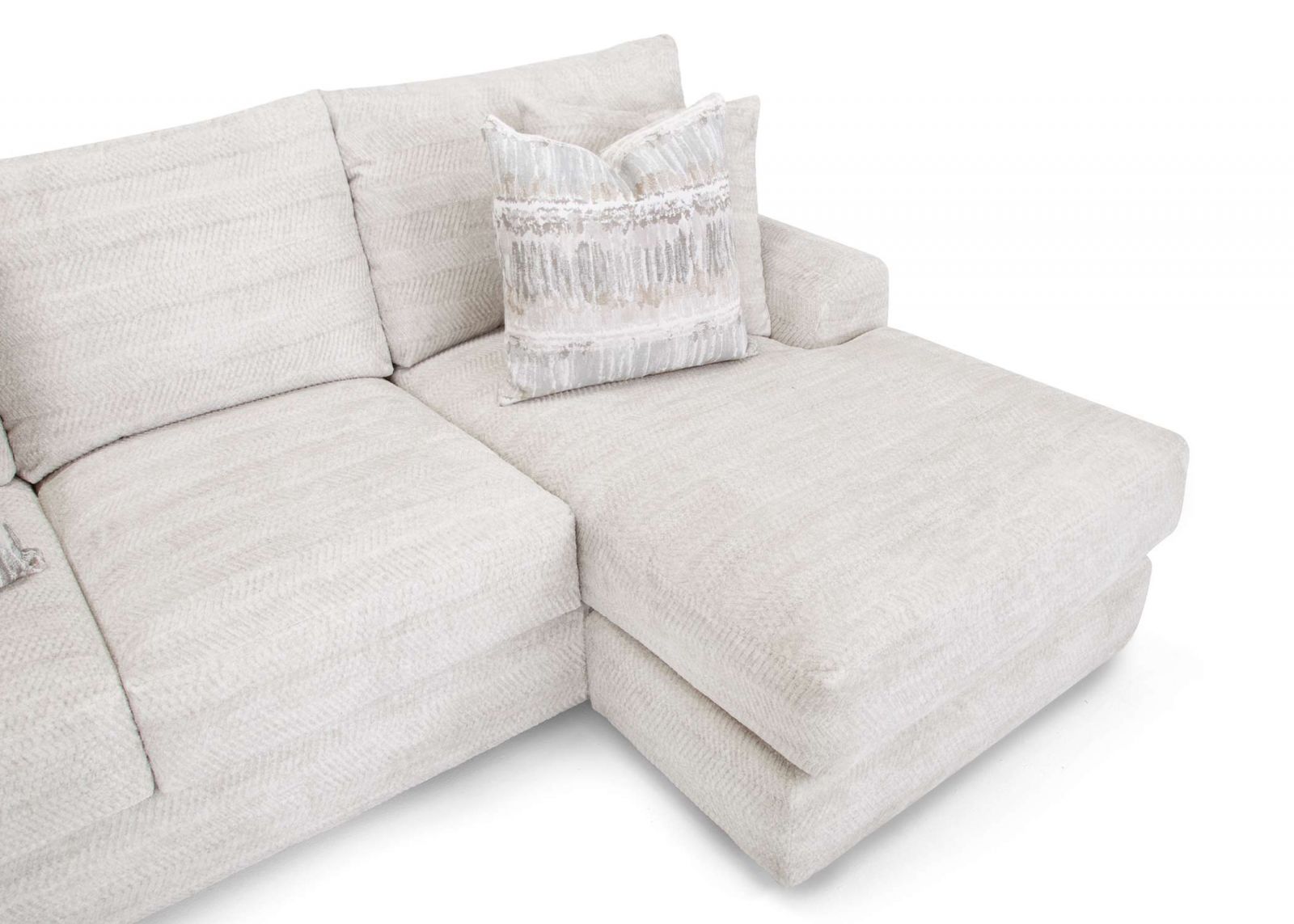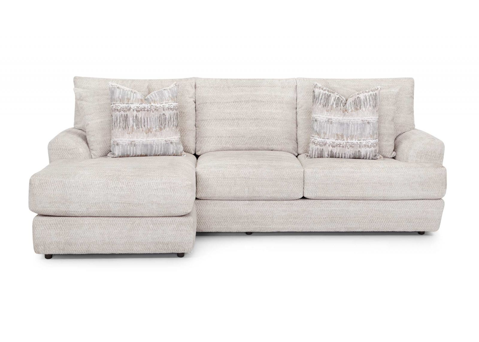Features//+ Sofa with reversible chaise ottoman//+ 100% WOW gel-blended foam//+ Reversible seat and back cushions//+ Throw pillows included//+ Solid wooden legs//+ 100% Polyester CC WS//+ Made in the USA of domestic and imported materials