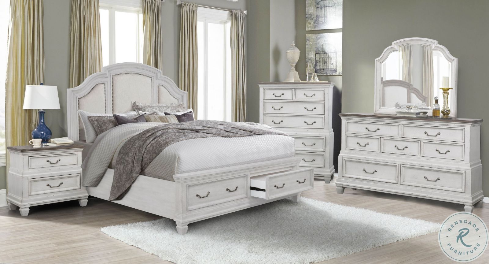 Features//+ Construction material: Rubberwood Solids and Birch/Acacia Veneers//+ Finish: Distressed white and light stained acacia top//+ Dresser features change cup and sliding jewelry tray//+ Nightstand features rapid USB charging port with wireless option and an adjustable led nightlight//+ Beds feature upholstered storage footboard