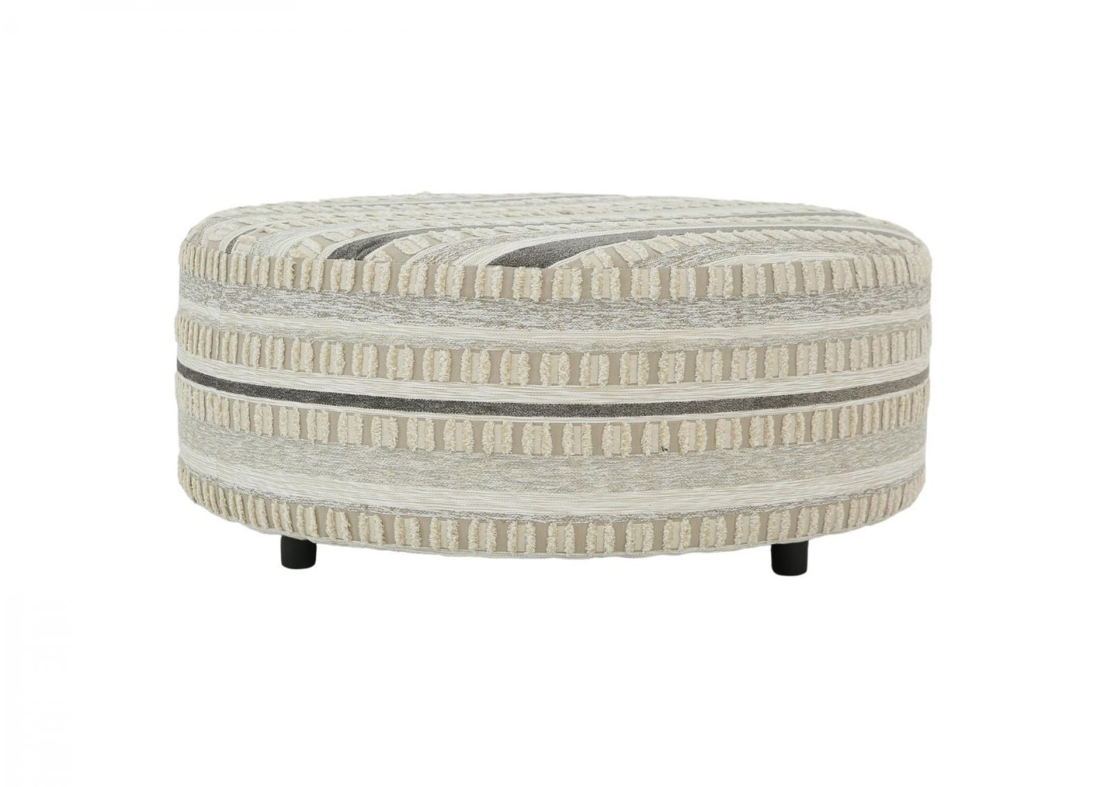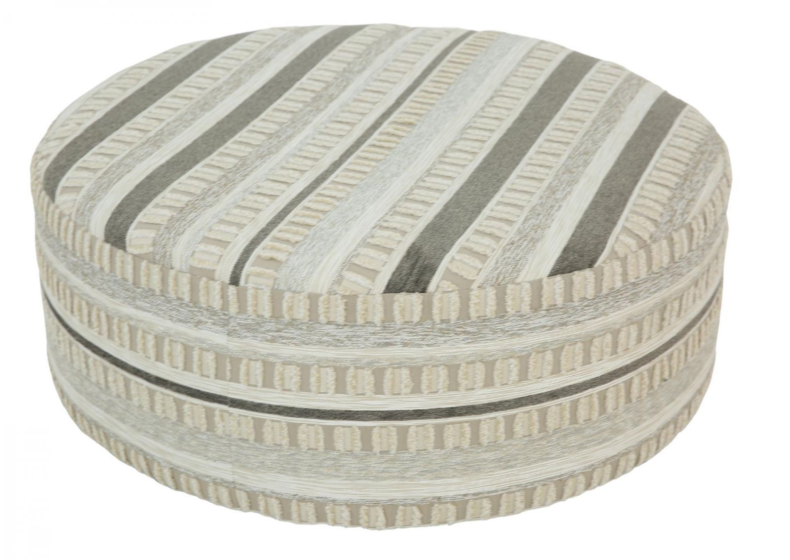 Features//+ Off-White Striped Round Ottoman//+ Comfortable footrest//+ Perfect place to display books or magazines//+ Great for living room, den, bedroom, or office.