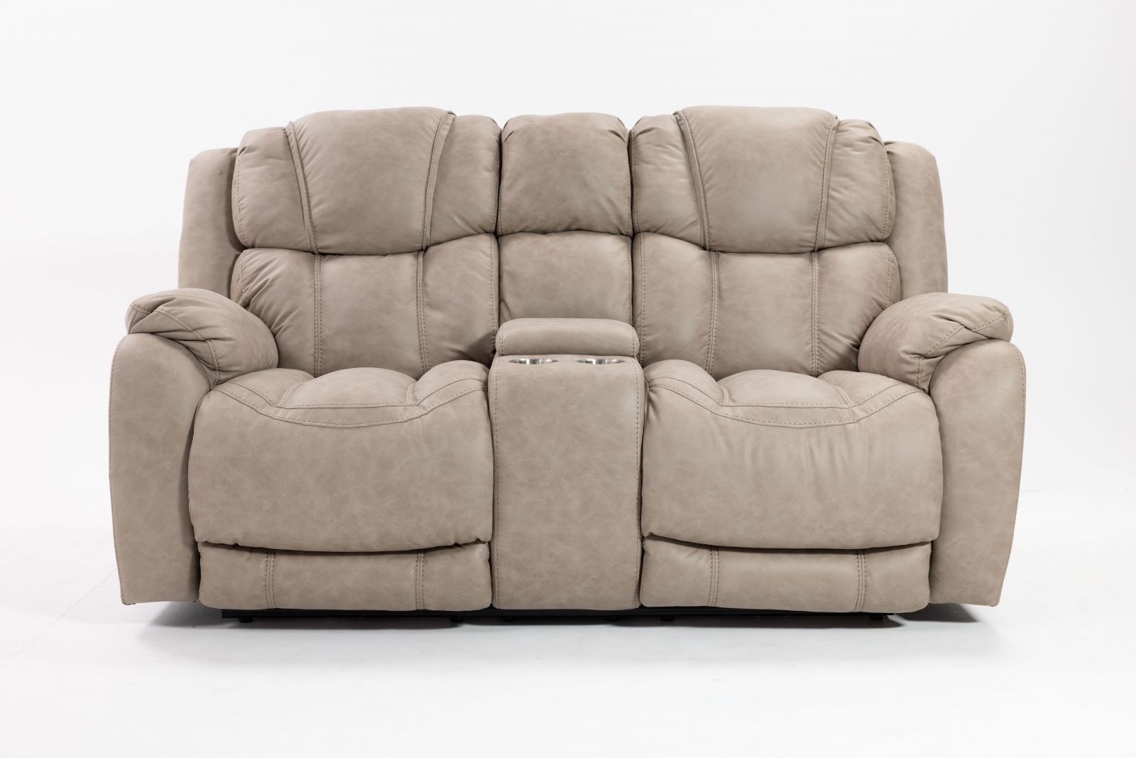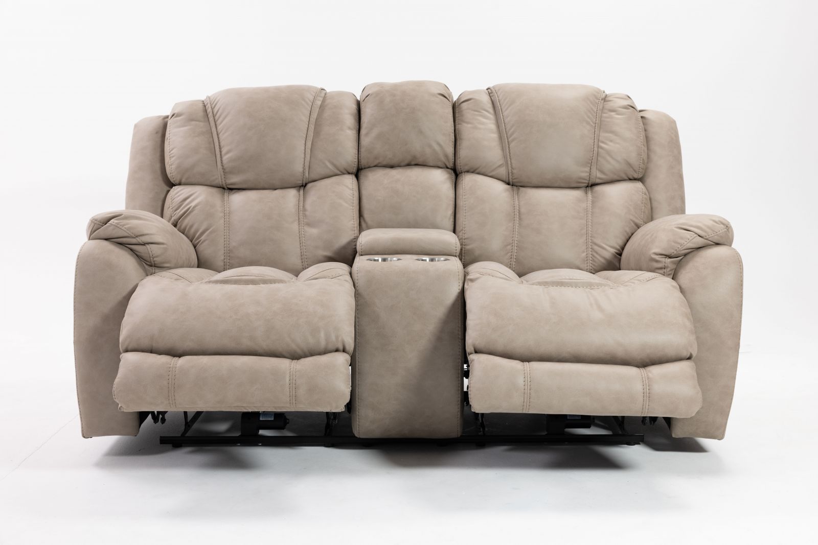 Console loveseat features storage compartment and cupholders