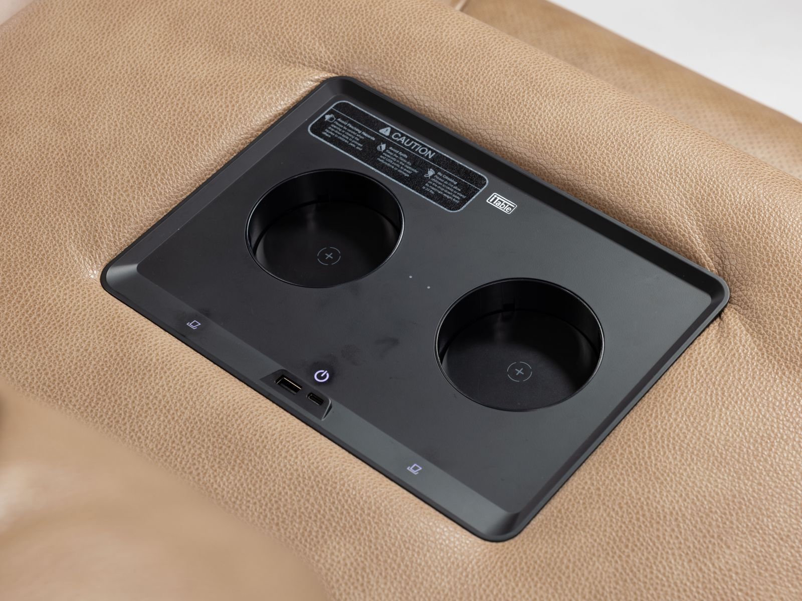 Power drop down table in armless chair with wireless charger, cupholders, and LED reading lights