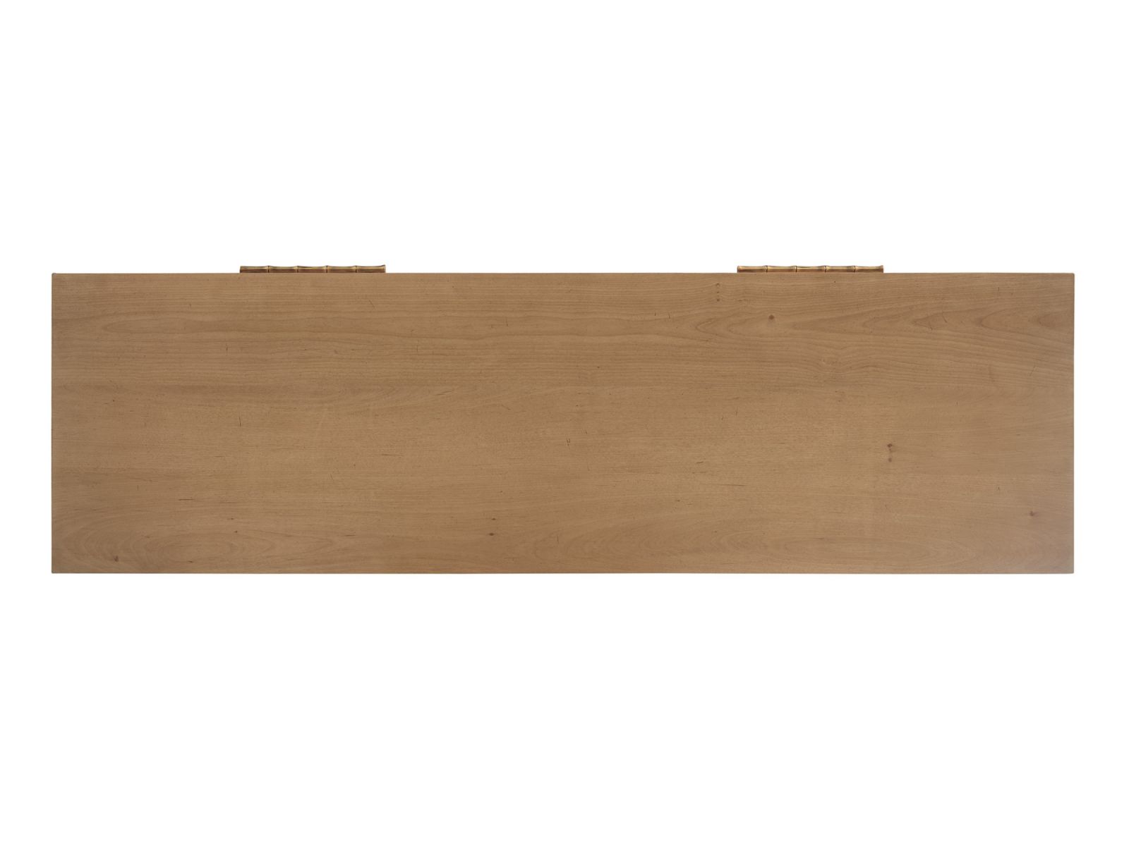 Drawer fronts textured with woven raffia, complemented by custom burnished brass finish