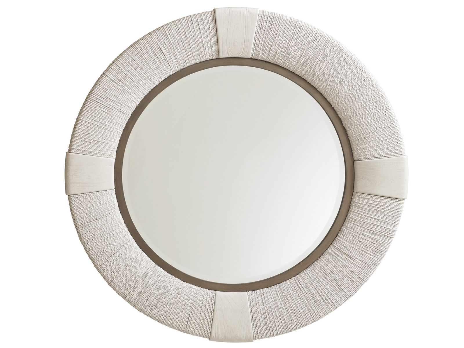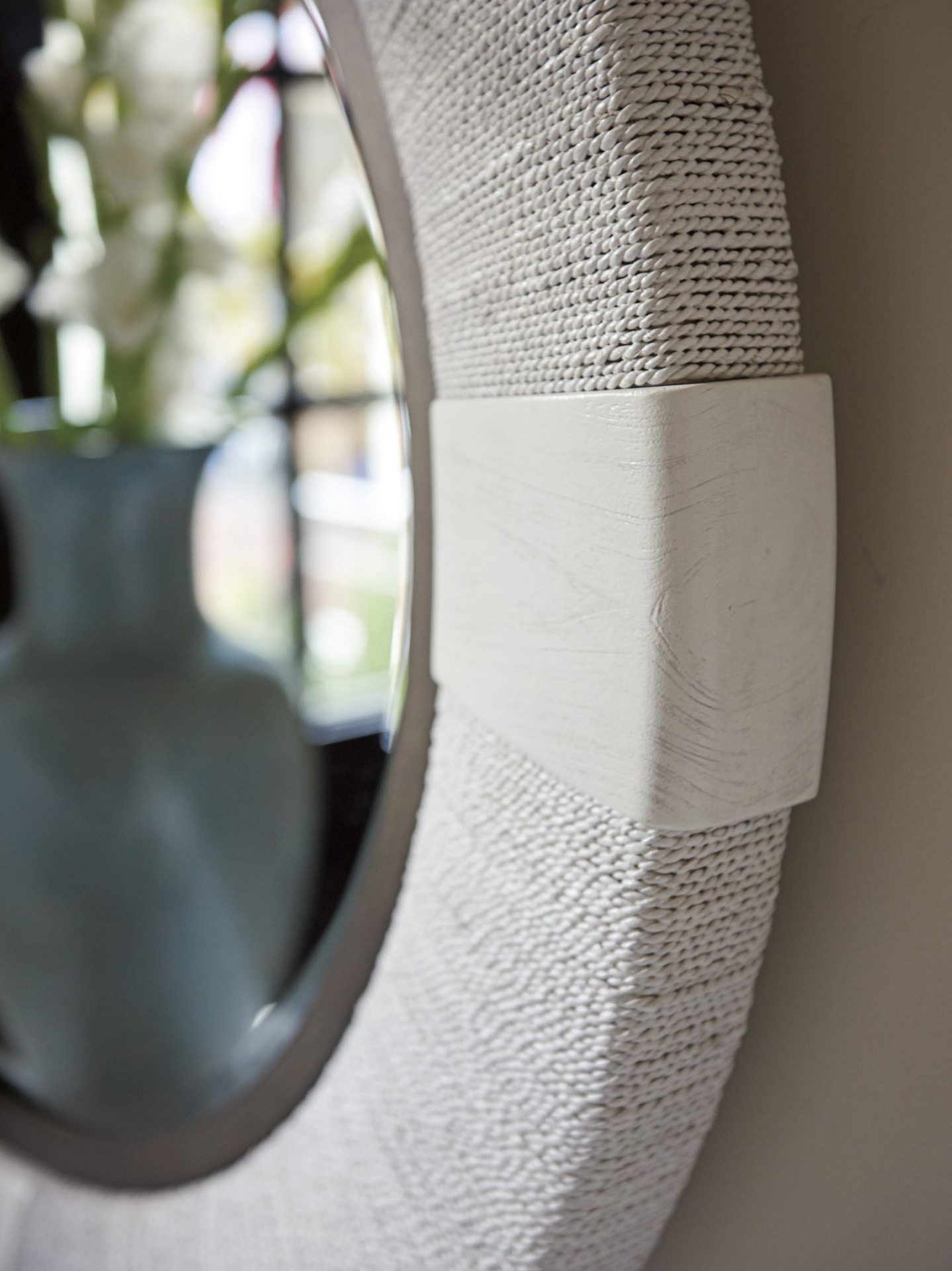 Features quartered mahogany veneers, a shell white finish, and an array of natural materials.